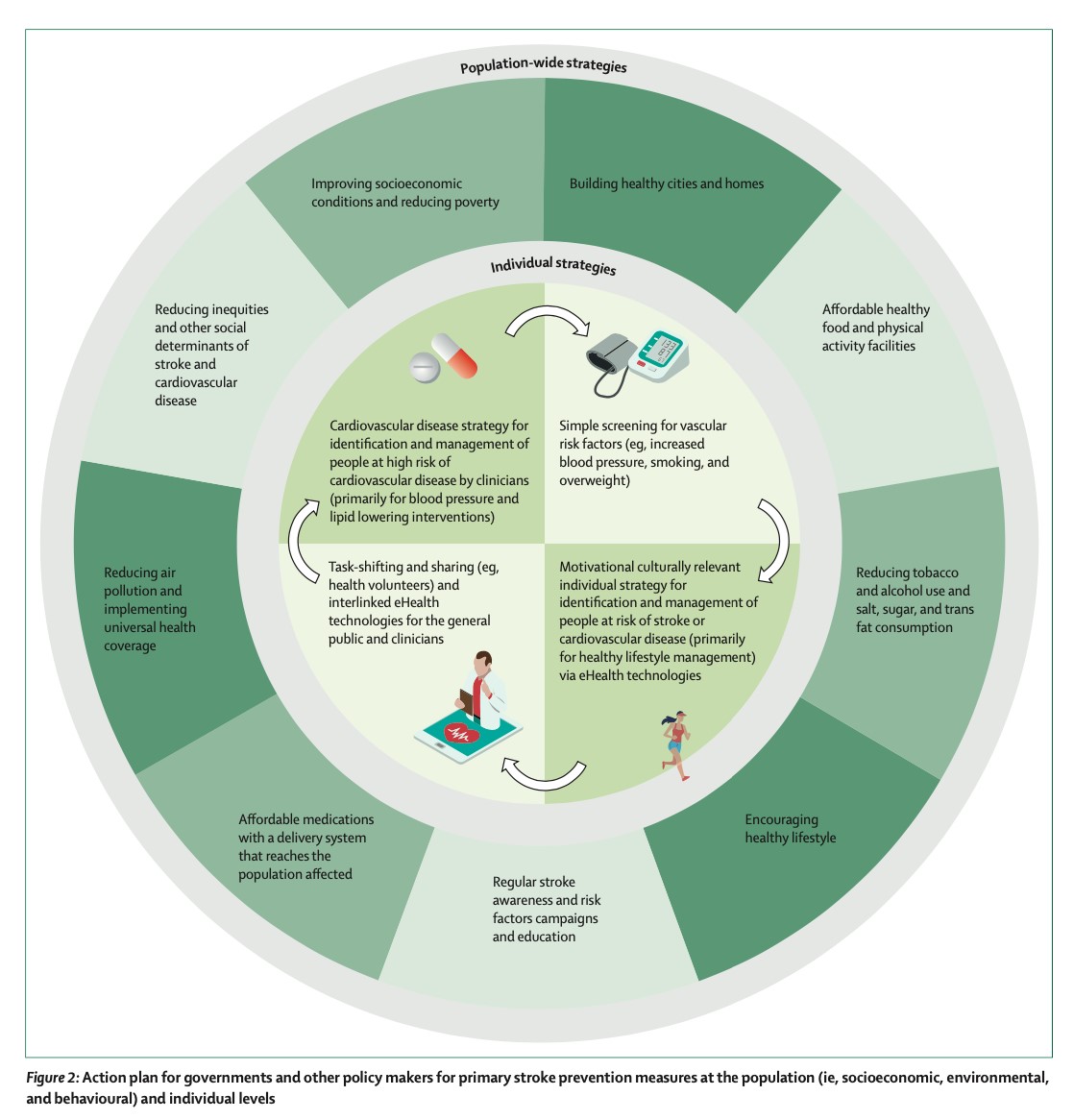 These data trends, set against a backdrop of lagging progress against government commitments to the address NCDS, suggest the need for clearly articulated primary stroke prevention at global and national level. Evidence supporting the case for investment in population-based primary prevention strategies targeting the top five drivers of stroke (high blood pressure, body mass index, diabetes, air pollution and smoking) suggests a significant returns on investment. Just $1 per person a day in low-income countries and $3 a day in middle income countries would reduce global stroke mortality by 10% save U$25 billion a year. Population wide primary prevention of stroke and cardiovascular disease has already been identified as an investment with 10-fold rate of return and stroke prevention strategies are likely to yield even higher returns, given that they will impact positively on the risk of heart disease, diabetes and some cancers.