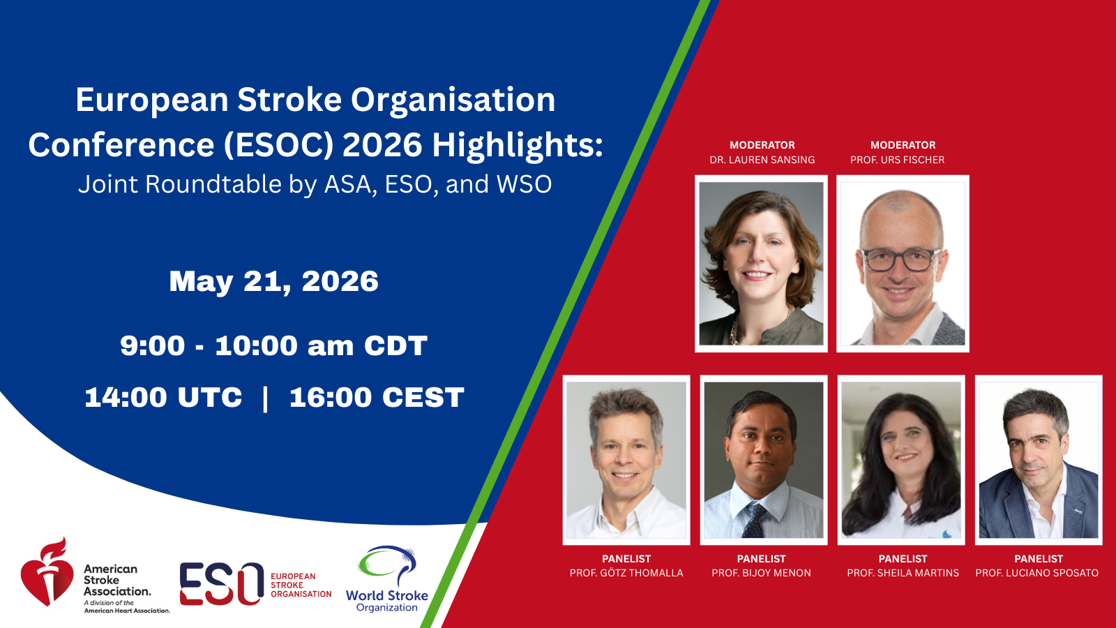 Description: Join this live roundtable webinar and Q&A session on Thursday, May 21 at 9:00 am CDT for discussion of the most important advances in research and clinical care of patients with stroke. Highlights from the 2026 European Stroke Organisation Conference will be presented by experts from leading stroke societies: American Stroke Association (ASA), European Stroke Organisation (ESO), and World Stroke Organization (WSO). The webinar will be hosted by the ASA. This collaborative session will highlight important research, evolving treatment strategies, and novel techniques in stroke care. The webinar is hosted by AHA/ASA