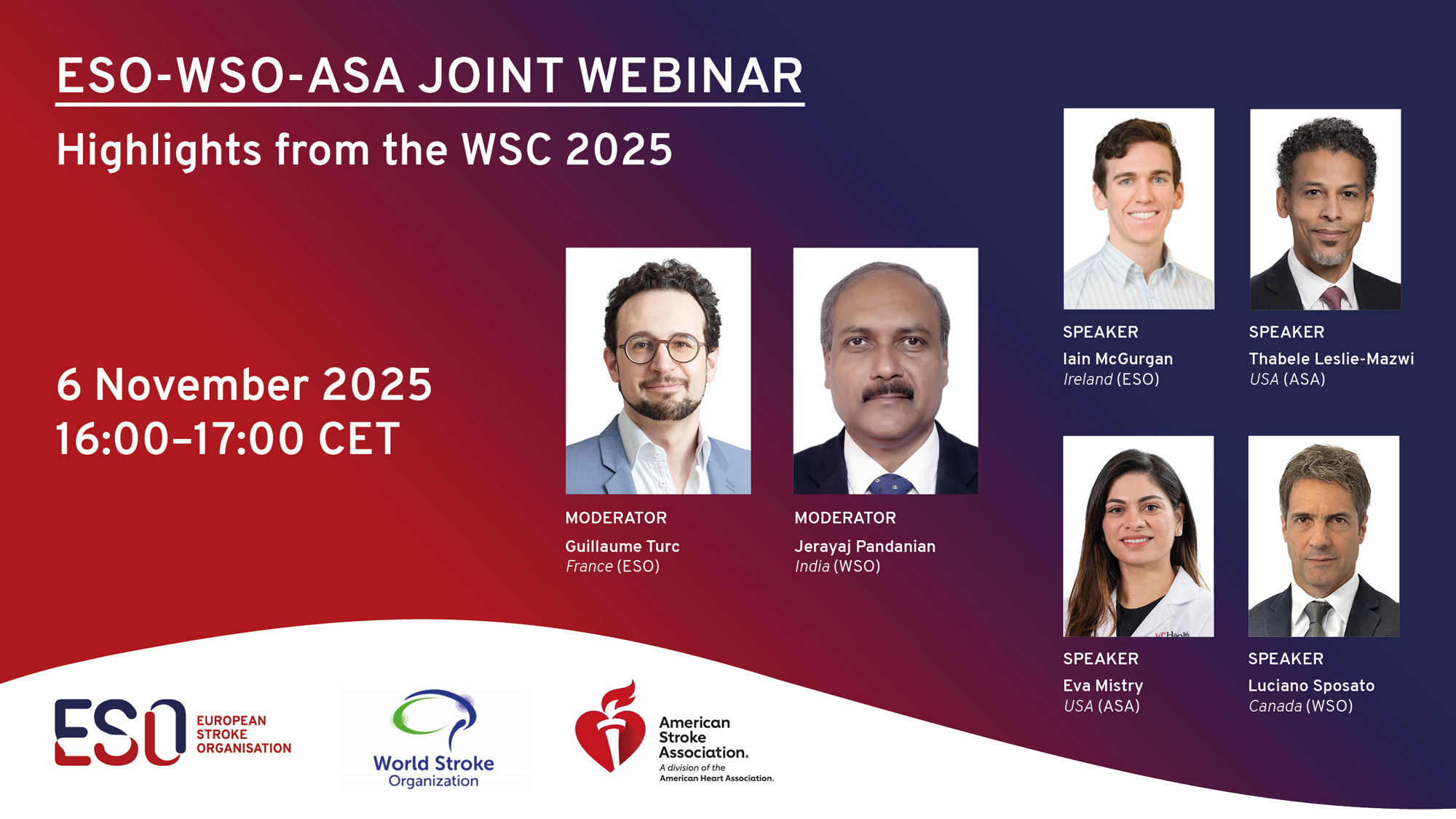 Description: Join us on Thursday, November 6, 2025, at 16:00 CET, for a live roundtable and Q&A session. Highlights from the 17th World Stroke Congress (WSC 2025) will be presented by experts from the European Stroke Organisation (ESO), the World Stroke Organization (WSO), and the American Heart Association/American Stroke Association (AHA/ASA). This session will feature expert discussions on the most important advances in research and clinical care of patients with cerebrovascular diseases. This webinar will be hosted by ESO.