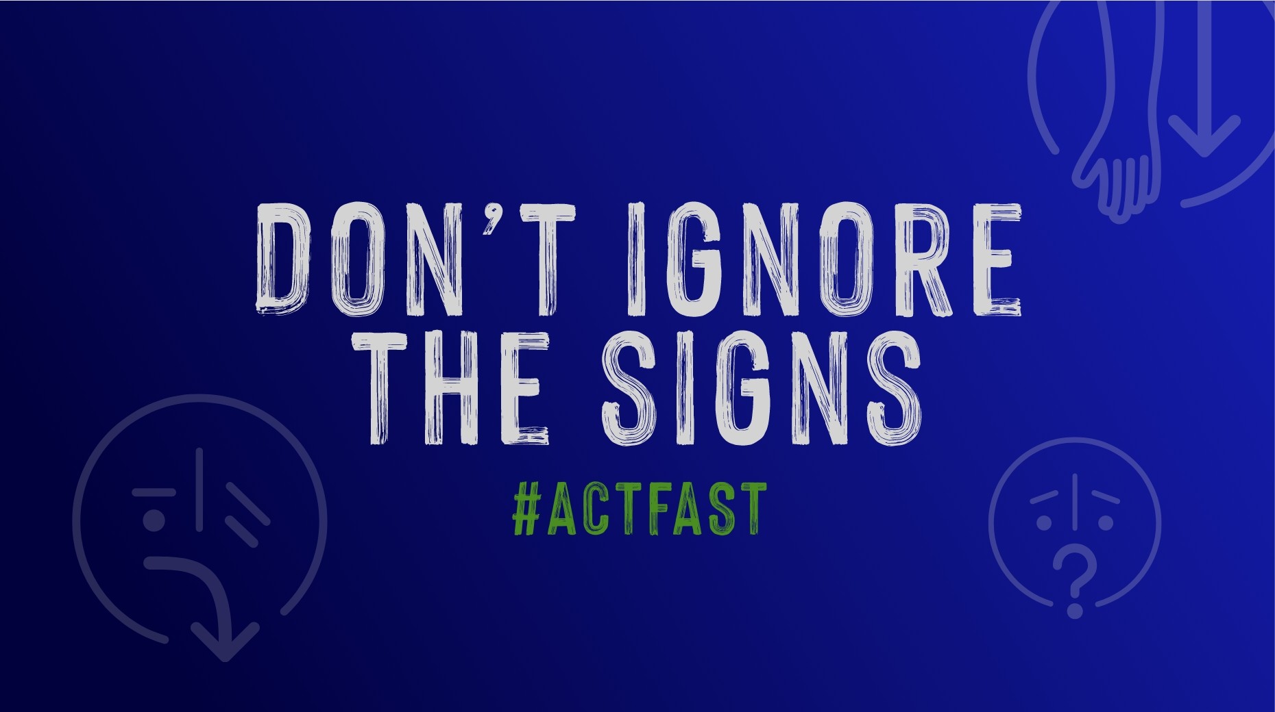 The key symptoms or stroke are facial drooping, speech difficulties and arm weakness on one side. (Some people may also experience visual disturbance and balance issues.) If you spot these signs call immediately for emergency medical help and say it's a stroke.